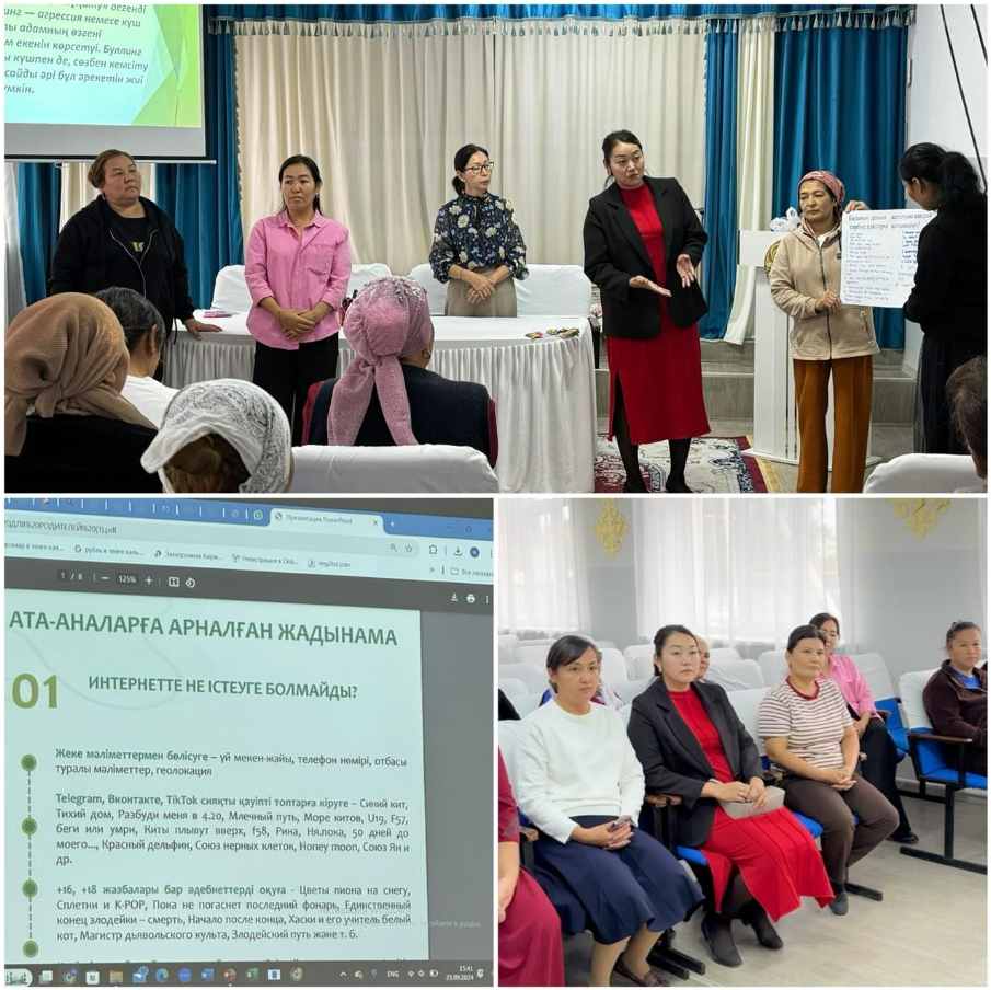 Жиналыс барысында мобильді қосымшаларда жасырылған қауіпті ойындар, буллинг, кибербуллинг сияқты қауіп-қатердің алдын алу жолдары туралы айта отырып, слайд,бейнебаян арқылы түсіндірілді. Сондай-ақ буллингке қатысты түрлі сұрақтар қойылды.