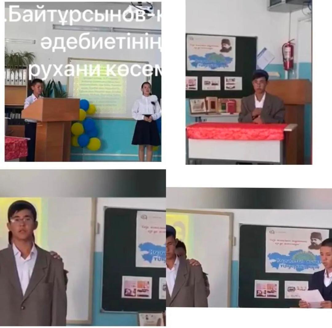 " А.Байтұрсынов-қазақ әдебиетінің рухани көсемі" атты ақынның 150 жылдығына байланысты тіл мерекесі қарсаңында әдеби кеш өтті.Тарихи өмірінде орны айрықша зор тұлға,ақын,қоғам қайраткері педагог ұстаз-Ахмет Байтұрсынұлы жас ұрпақты адамгершілікке,ұлтжандылыққа, Отансүйгіштікке баулып тірбиелейді. Халқының бостандығы,тәуелсіздігі,еркіндігі үшін тар заманда жан аямай күрескен ұлы азамат Ахмет Байтұрсынұлы қазақ халқының мәңгі есінде. Әдеби кешке 5,8,9 сыныптар қатысып,ұшт зиялысының өмірінен шығармаларынан мағлұмат берді.