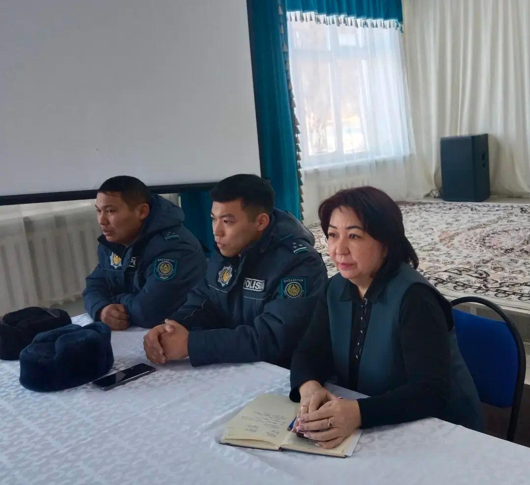 Мектептің 8-11 сыныптарының ұлдары арасында ауылдық учаскелік полиция инспекторлары М.Жолболдинов, Т.Ғалымжанұлымен кездесу өткізілді. Максаты кәмелетке толмаған жасөспірімдер арасында құқықбұзушылықтың алдын алу, құқықтық сауаттылығын арттыру. Аталған шара барысында оқушыларға қылмыстық жауапкершілік туралы түсінік берілді.