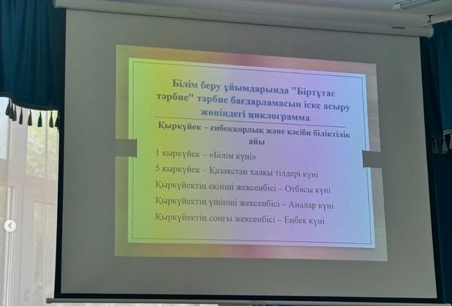 2024-2025 оқу жылы бойынша, 31 тамыз күні ДТІЖО А.Нұртілеу мен Н.Закиева сынып жетекшілер арасында “Біртұтас тәрбие” бағдарламасының ағымдағы оқу жылында жүзеге асырылуы туралы түсіндіріп, таныстырды.