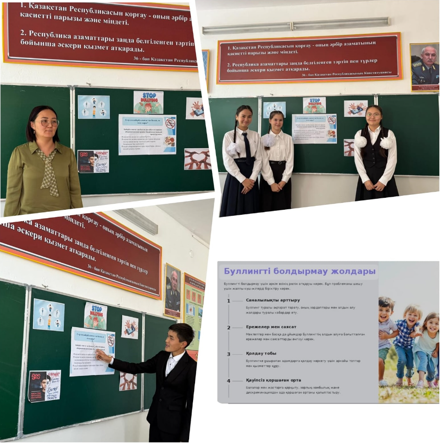 Мақсаты: оқушылардың тұлғааралық қарым-қатынасындағы толеранттылықты арттыру және қақтығыстардың алдын алу. Оқушылар буллинг және кибербуллинг ұғымдарымен, оның зардаптарымен танысты. Оқушылар топпен жұмыс жасап, сыныптың негізгі ережелерін жазды. Сынып жетекшісі А.Омарова